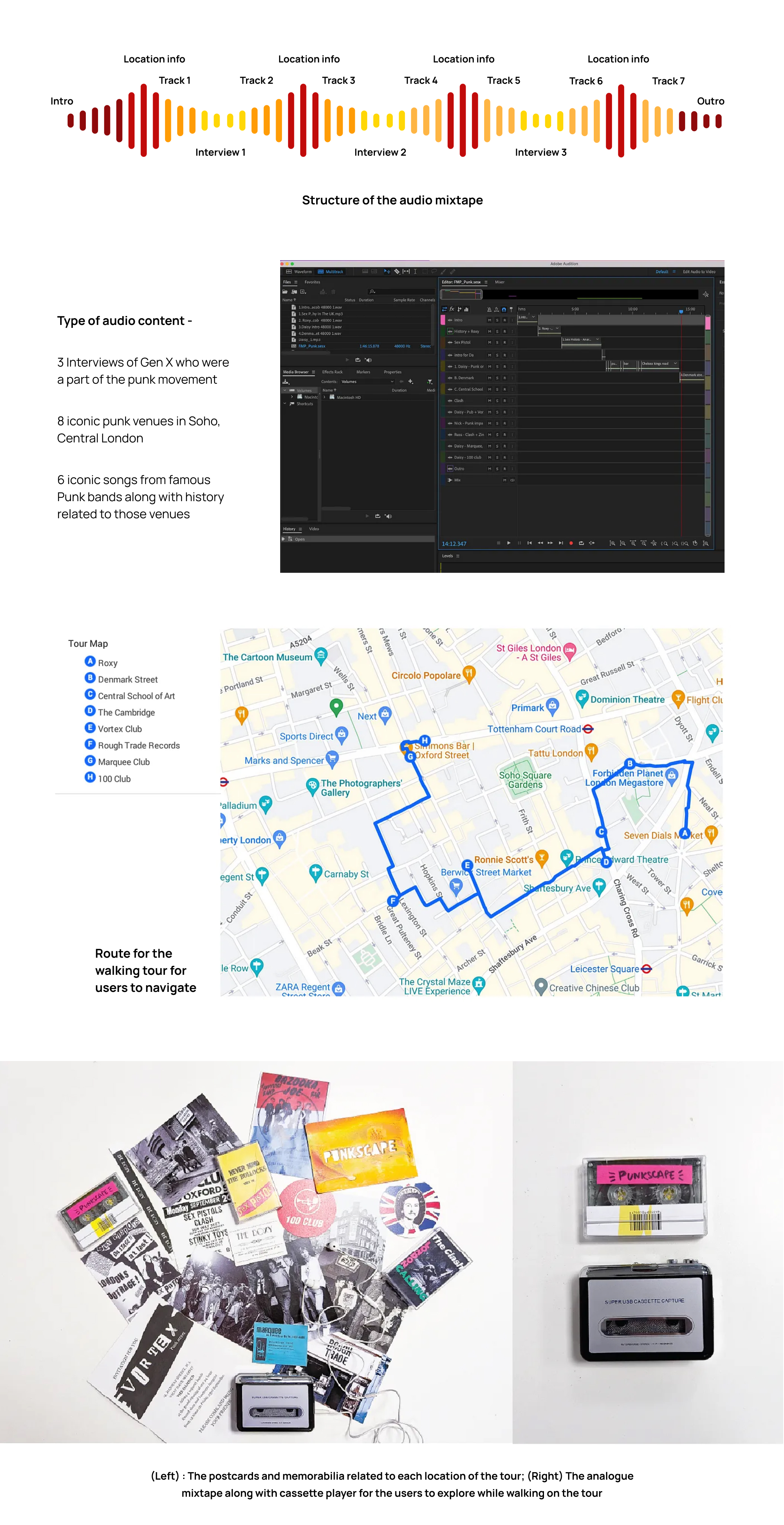 Punkscape is an interactive audio experience for music enthusiasts and travellers in London. It is a self-guided tour on an analogue mixtape with hidden clues. The walking tour aims to create a sense of discovery among users and give them a new perspective on Soho's musical history through the lost punk venues in Central London. Additionally, it explores the history of the British punk subculture in the UK.